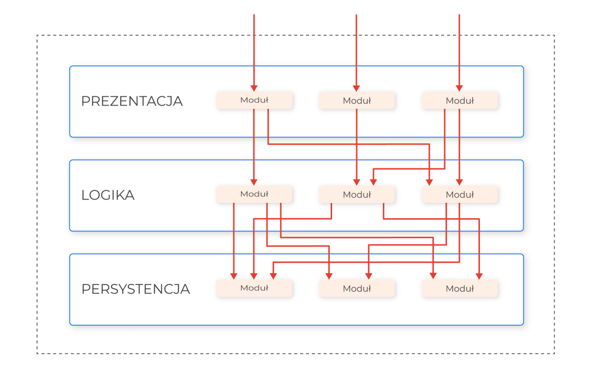 Problem z architekturą warstwową jest taki, że w rzeczywistości wygląda ona nieco inaczej. Mamy moduły naszej aplikacji i przepływ od góry do dołu. Dopóki aplikacja nie jest duża, udaje nam się utrzymać prawidłowy przepływ. Problemem jest moment w którym aplikacja masowo przyrasta – zwiększa się ilość zespołów nad nią pracujących, powstają nowe, szybkie featuer’y. Biznes chce widzieć efekty jak najszybciej, tworzy presję na developerach a to zazwyczaj prowadzi do tego, że nie myślimy o designie aplikacji jako całości. Skupiamy się wyłącznie na tym co chemy dostarczyć w tym momencie – jak najszybciej. Końcowo doprowadza to do architektury warstwowej, która już nie wygląda tak pięknie jak była przedstawiana w tutorialach.