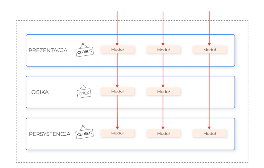 Możemy sobie wyobrazić sytuacje kiedy piszemy bardzo prostego CRUD’a. Nie posiada on logiki biznesowej (lub posiada jej bardzo mało). Czy powinniśmy w takim razie tworzyć warstwę logiki? Są dwie szkoły. Jedna, bardziej restrykcyjna mówiąca, że obligatoryjnie tworzymy wszystkie warstwy wymagane w projekcie a przepływ w naszej aplikacji jest zawsze taki sam. Przy takim podejściu mówi się, że warstwy są zamknięte. Natomiast druga szkoła pozwala na rozluźnienie, warstwy mogą być otwarte. Które podejście jest lepsze? Oba są prawidłowe. W architekturze jest dużo abstrakcji i stety, niestety wyraz to zależy może być używany bardzo często.