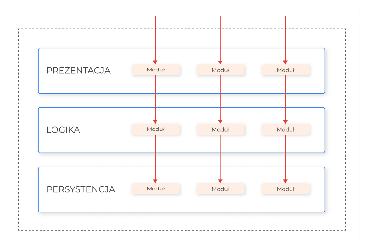- komunikacja jest kierowana od góry do dołu (warstwa prezentacji wykorzystuję logikę a ta persystencję)