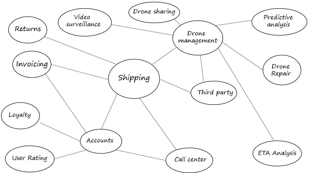 Firma XYZ uruchamia usługę dostaw przy pomocy dronów. XYZ zarządza całą flotą dronów. Jej użytkownicy mogą poprosić o drona do odbioru towaru. Kiedy klient planuje odbiór, system backendowy przydziela drona i powiadamia użytkownika o przewidywanym czasie dostawy. W trakcie realizacji dostawy klient może śledzić lokalizację drona, dzięki stale aktualizowanemu systemowi. XYZ pozwala również na usługi firm zewnętrznych – firma chcąca być podwykonawcą rejestruje się w serwisie i również może dostarczać przesyłki. Z punktu widzenia klienta końcowego usługi nadal są świadczone przez firmę XYZ.