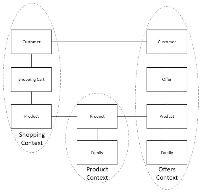 Bounded Context definiuje granice podsystemu. Zawiera swój model domenowy i co jest bardzo ważne nie współdzieli danych modelu z innym kontekstami. W praktyce oczywiście jest tak, że różne Bounded Context’y muszą komunikować się ze sobą. Komunikacja taka nie jest niczym złym – bez tego nasze oprogramowanie miałoby ciało ale nie miało przykładowo rąk czy nóg, innymi słowy – nie działałoby jako całość. BC komunikują się między sobą przez jasno zdefiniowane API.