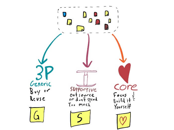 • główna (core domain) – najważniejsza część systemu. Dzięki niej biznes odnosi sukces i ma przewagę nad konkurencją. Odpowiada na pytania dlaczego powstaje (powstał) dany system i dlaczego go nie kupiliśmy.