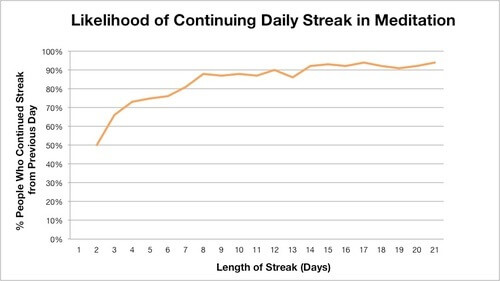 Na początku nie powinniśmy być zbyt ambitni. Poniżej przedstawiłem wykres z bloga Coach.me, przedstawiający procentową szansę na kontynuowanie (w tym przypadku) nawyku medytacji. Wystarczą dwie minuty każdego dnia, żeby po 11 dniach mieć ponad 90% szans na utworzenie tego nawyku na całe życie. Z czasem możemy manipulować danym nawykiem, przedłużając/skracając go odpowiednio do naszych potrzeb. Na początku po prostu zacznij!