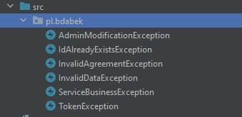 Jest mi głupio, bo sam w to brnąłem. Tworzyłem nowe wyspecjalizowane wyjątki, których nie miałem zamiaru obsługiwać. Definiujesz customowy wyjątek? Rób to tylko i wyłącznie w przypadku, gdy wiesz, że będziesz go obsługiwał!